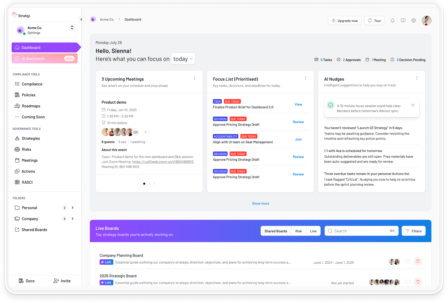 This customisable digital platform turns strategic intent into live priorities, accountable decisions, and visible progress across leaders and teams. Not as static plans or documents, but as a connected system that evolves as the work unfolds.
