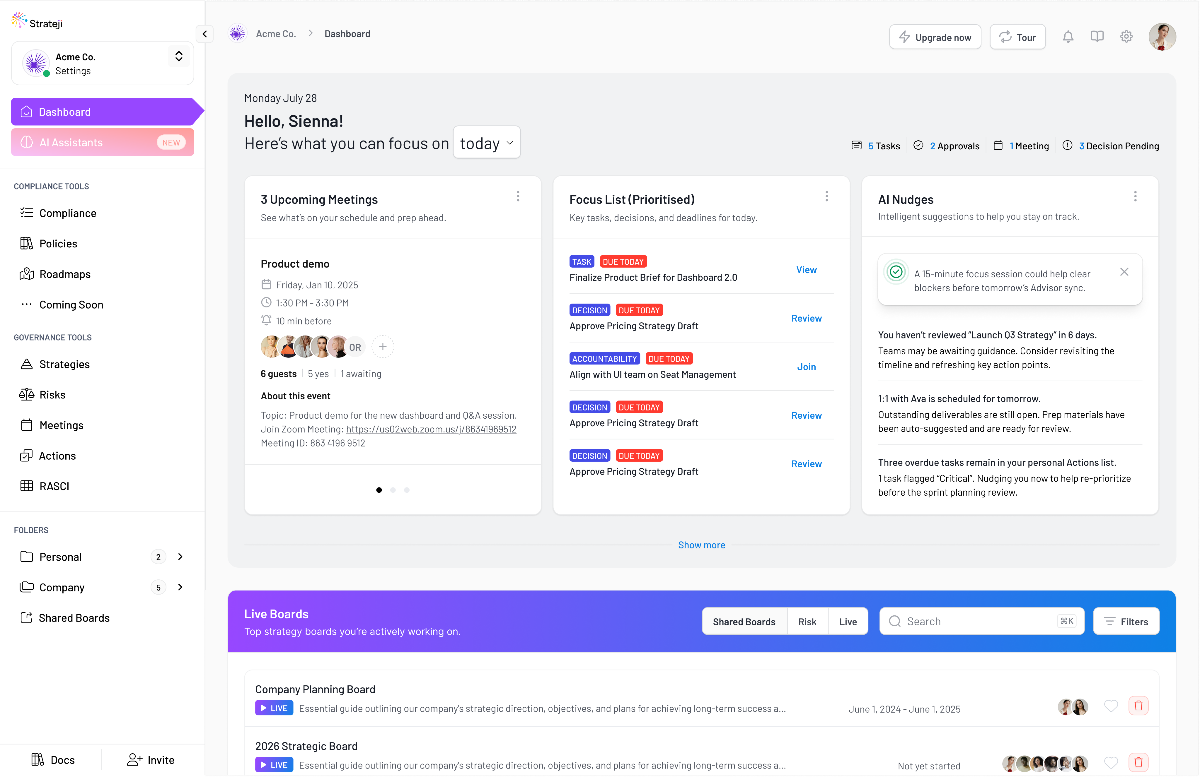 This customisable digital platform turns strategic intent into live priorities, accountable decisions, and visible progress across leaders and teams. Not as static plans or documents, but as a connected system that evolves as the work unfolds.